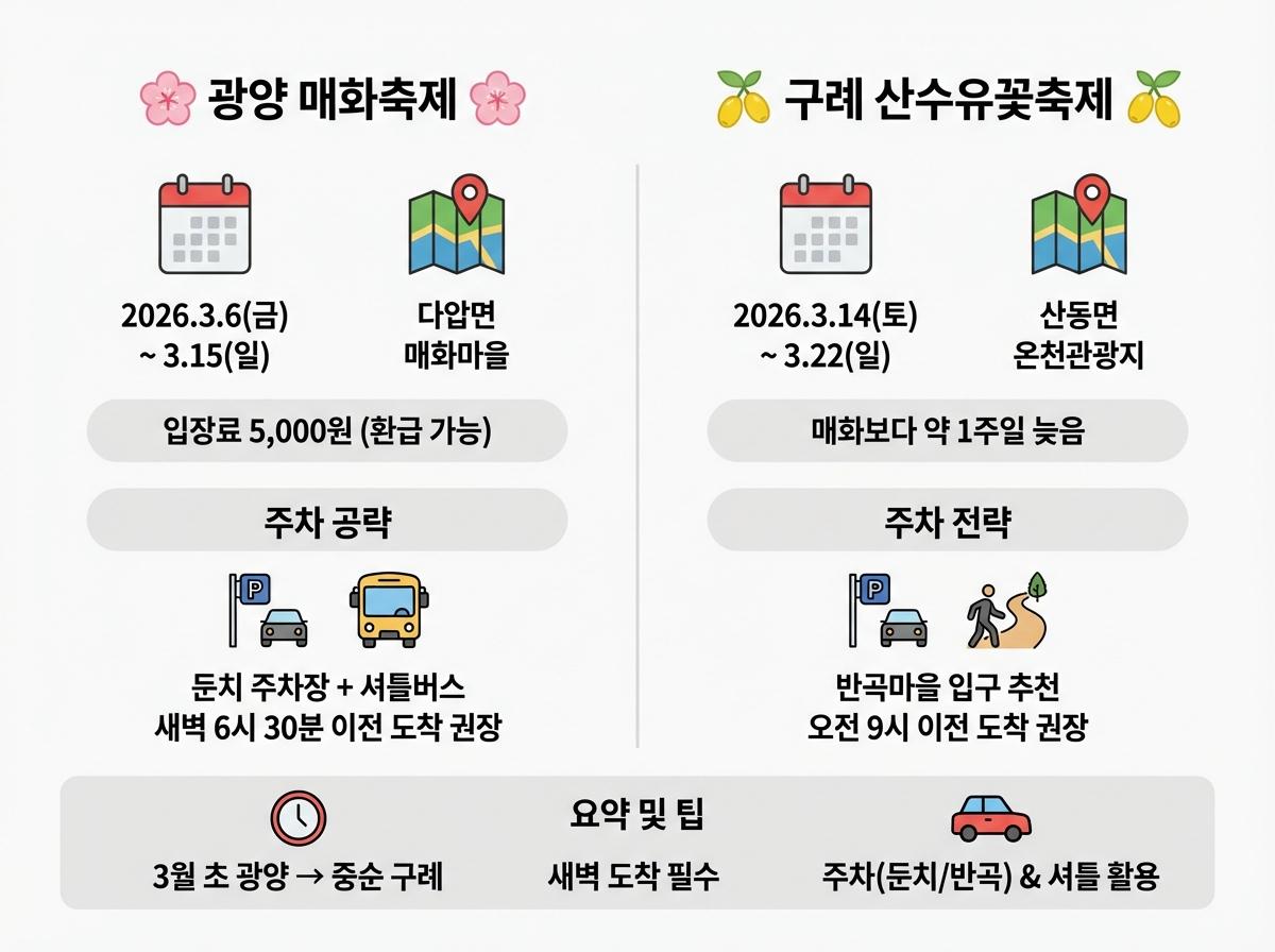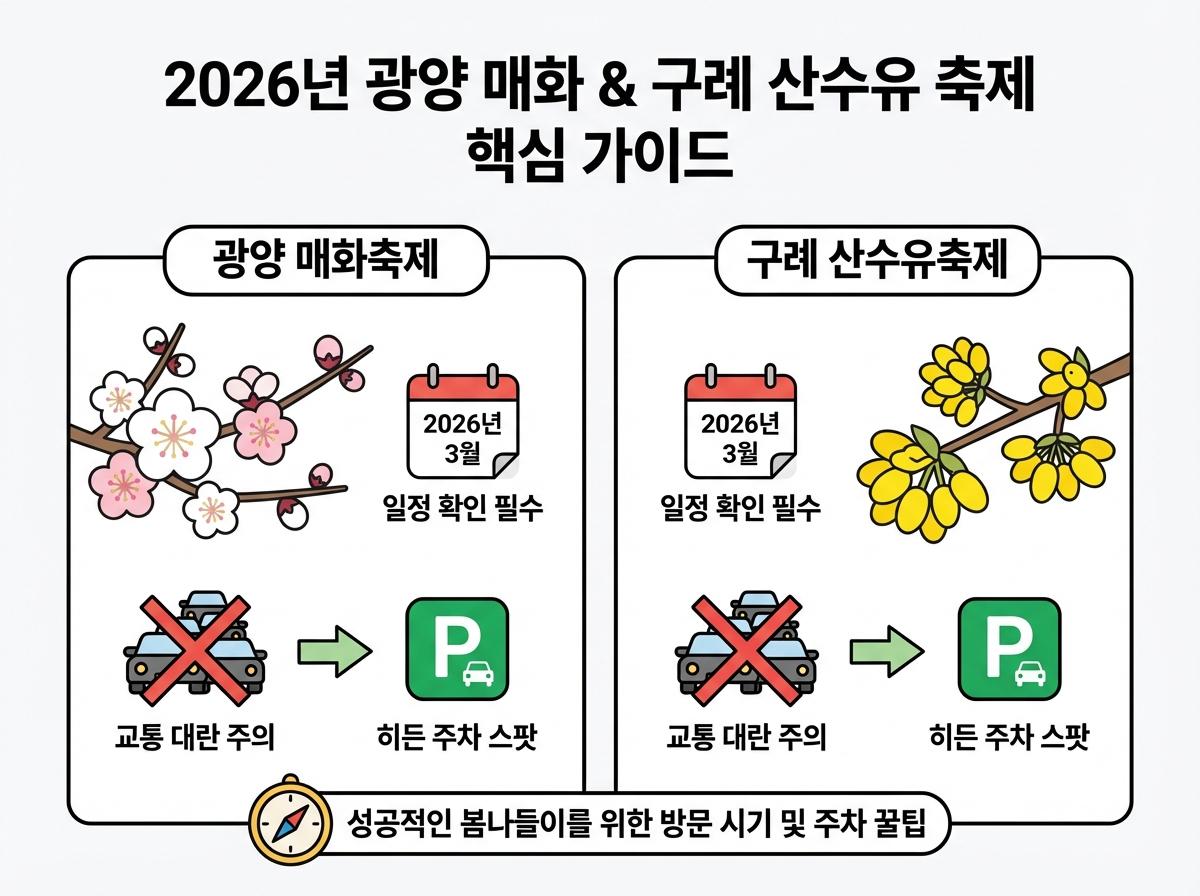 두 축제 모두 극심한 교통 체증이 예상되므로 새벽 도착이 필수이며, 특히 광양은 둔치 주차장, 구례는 반곡마을 인근을 공략하는 것이 효율적입니다.