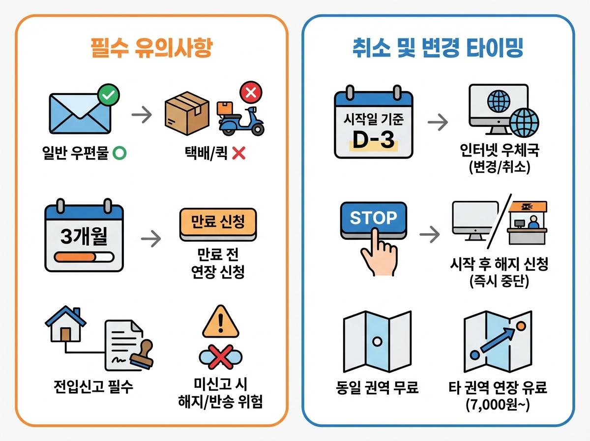 - 서비스 개시일 변경이나 신청 취소는 시작일 기준 3일 전까지만 인터넷 우체국에서 가능합니다.