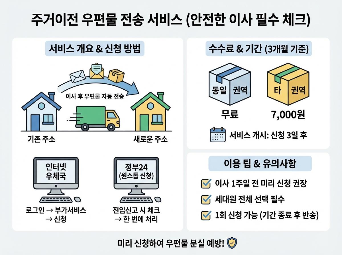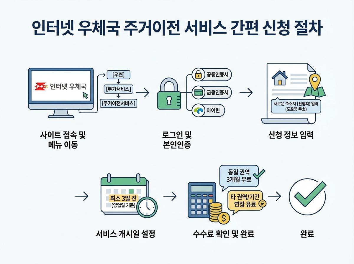 인터넷 우체국이나 정부24를 통해 간편하게 신청할 수 있으며, 동일 권역 이동 시 3개월간 무료로 이용 가능합니다.