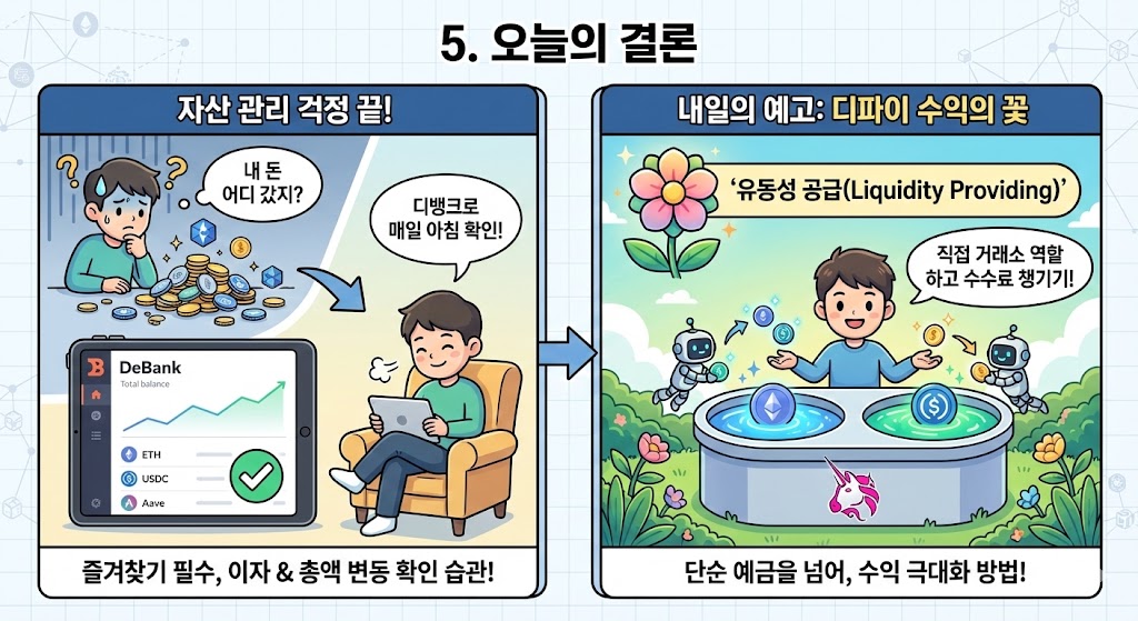 내일은 디파이 수익의 꽃이라 불리는 *'유동성 공급(Liquidity Providing)'*에 대해 배워보겠습니다. 단순히 예금하는 것을 넘어, 내가 직접 거래소 역할을 하고 수수료를 챙기는 방법입니다.