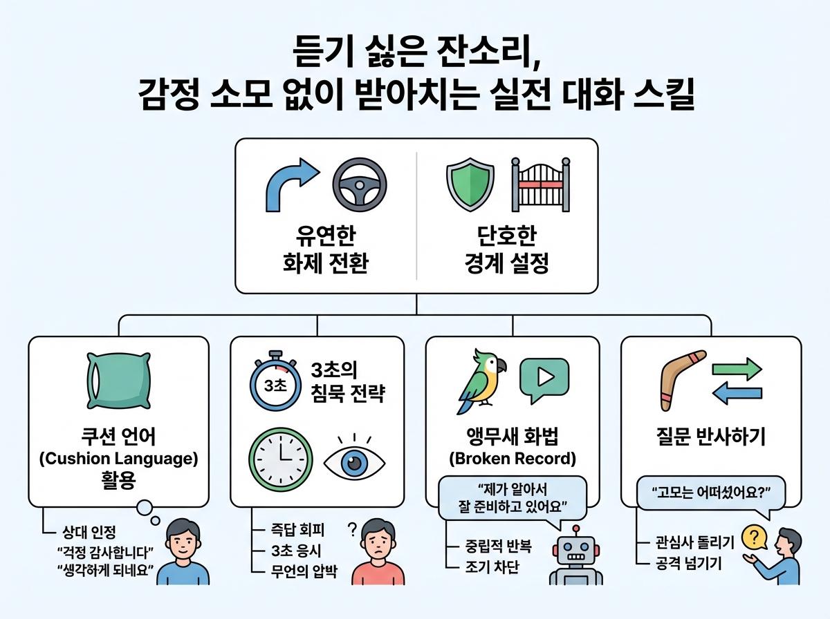 감정적으로 대응하면 오히려 스트레스만 가중됩니다. 핵심은 '인정 후 화제 전환' 기술을 사용하여 대화의 주도권을 가져오는 것입니다.