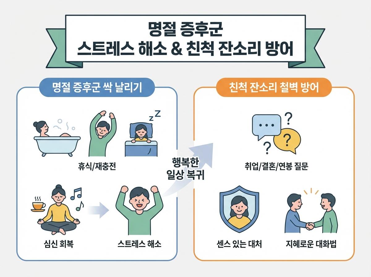명절 스트레스의 주범인 친척들의 간섭에는 무대응보다 유연한 화제 전환과 단호한 경계 설정이 필수적입니다.