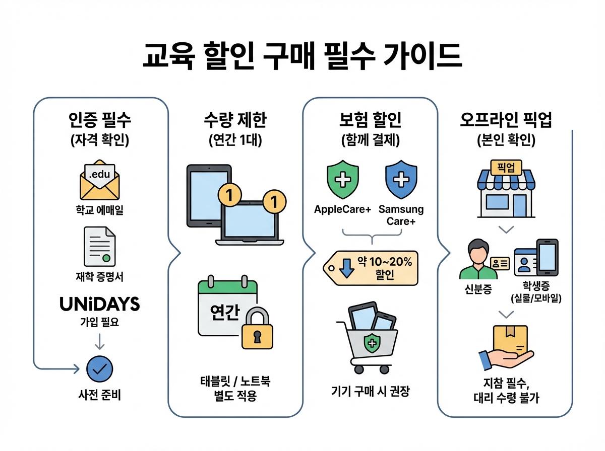 - 구매 자격 인증을 위해 학교 이메일(.edu) 또는 재학 증명서가 필수이며, 애플은 UNiDAYS 가입을 미리 마쳐야 원활한 결제가 가능합니다.