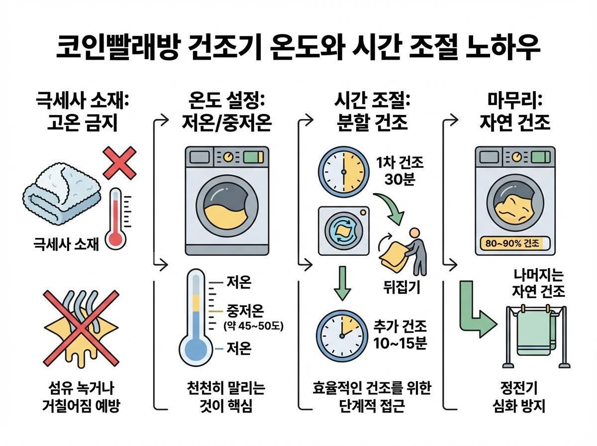 코인빨래방 건조기 이용 시에는 고온이 아닌 저온이나 중저온으로 설정하는 것이 핵심이며, 한 번에 끝내기보다 중간에 뒤집어주며 총 40~50분 정도 건조하는 것이 가장 효율적입니다.