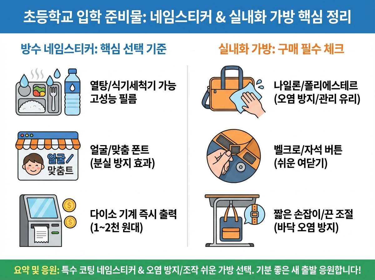 초등학교 입학 준비물 중 네임스티커는 단순 방수가 아닌 고온 세척을 견디는 특수 코팅 재질을 선택하고, 급할 때는 오프라인 키오스크를 활용하는 것이 좋습니다.