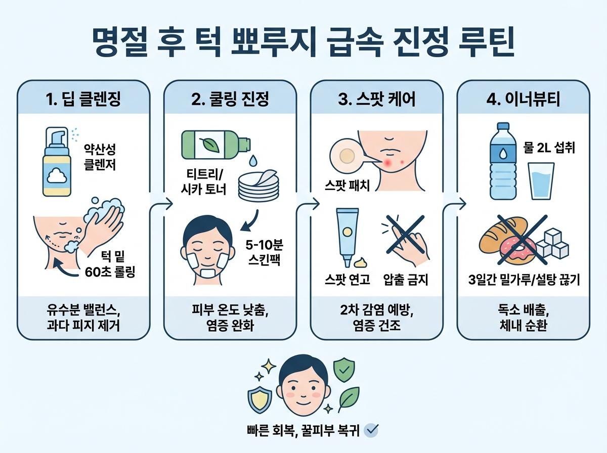 명절 직후 턱 뾰루지를 가라앉히기 위해서는 약산성 클렌저로 턱 밑 피지를 60초간 꼼꼼히 제거하고 티트리 팩으로 피부 열감을 내려야 합니다.