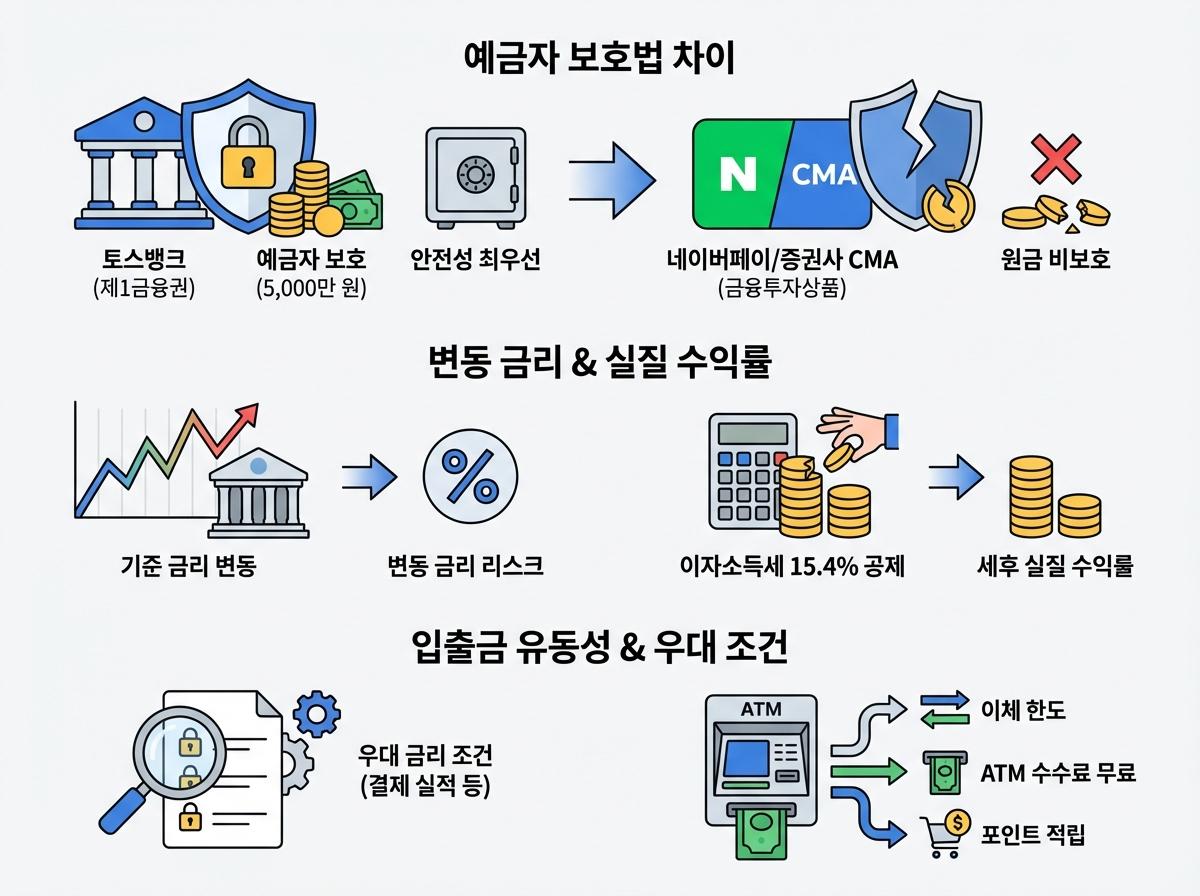 토스뱅크는 금액 제한 없는 유동성과 편리한 UI가 강점이며, 네이버페이는 소액 구간에서의 높은 금리 효율과 강력한 포인트 적립이 특징입니다.