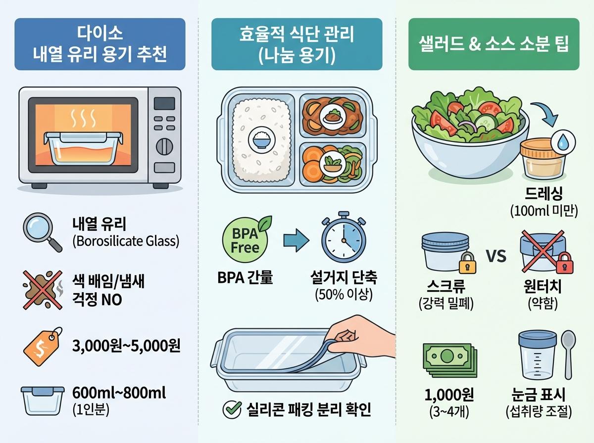 다이소의 가성비 좋은 내열 유리 용기나 BPA Free 용기를 활용하면 초기 비용도 최소화할 수 있습니다.
