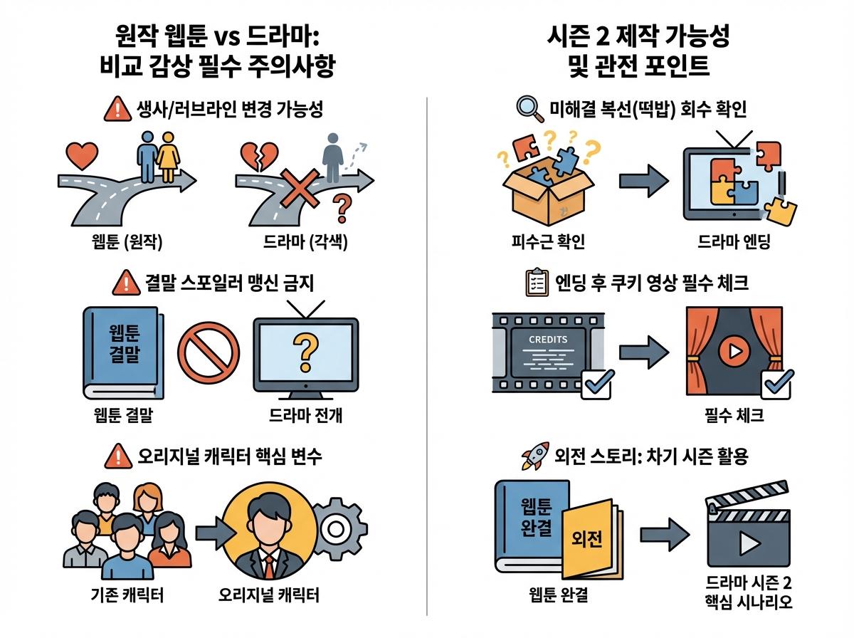 - 원작에서 회수되지 않은 **미해결 복선(떡밥)**이 드라마 엔딩에서 어떻게 다루어지는지 확인해야 합니다.
