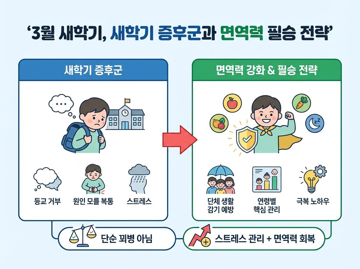 - 새 학기 적응 스트레스는 코르티솔 수치를 높여 면역 기능을 직접적으로 저하시킵니다.