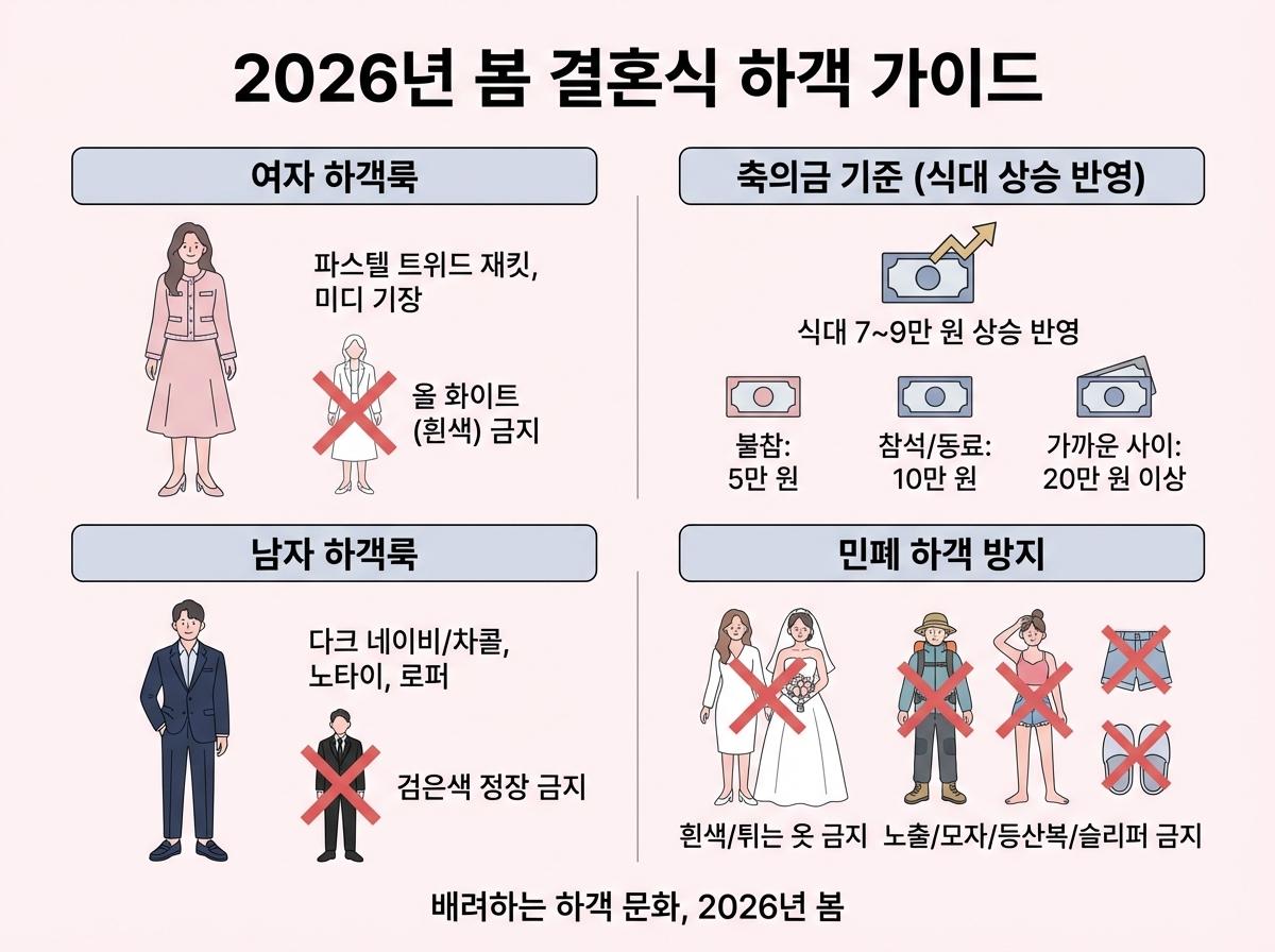 2026년 웨딩 트렌드와 물가를 반영한 센스 있는 하객 복장 추천 및 관계별 적정 축의금 가이드.
