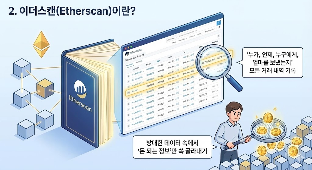 하지만 블록체인 세계는 다릅니다. 수천억 원을 굴리는 거대 투자자(고래)가 지금 이 순간 어떤 코인을 매집하고 있는지, 어디로 돈을 보내는지 전 세계 누구에게나 실시간으로 공개됩니다. 이 정보를 볼 수 있는 사이트가 바로 *이더스캔(Etherscan)*입니다.