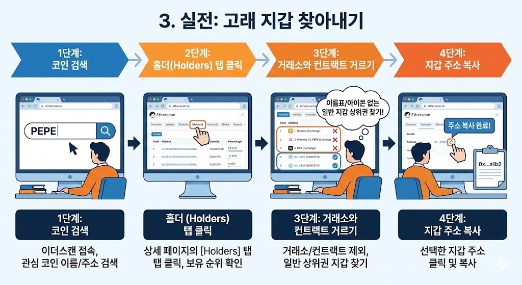 3단계: 거래소와 컨트랙트 거르기 상위권에는 보통 'Binance', 'Uniswap' 같은 거래소나 스마트 컨트랙트 주소가 있습니다. 아이콘이 붙어 있거나 이름표가 붙어 있는 이들을 제외하고, 이름 없는 일반 지갑 주소 중 상위권(4등, 5등 등)을 찾습니다.