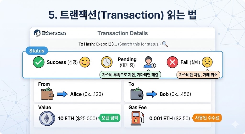 특히 Pending 상태라면 가스비를 너무 적게 내서 밀려있는 것이니 기다리면 됩니다. Fail이 떴다면 가스비만 차감되고 거래는 취소된 것입니다.