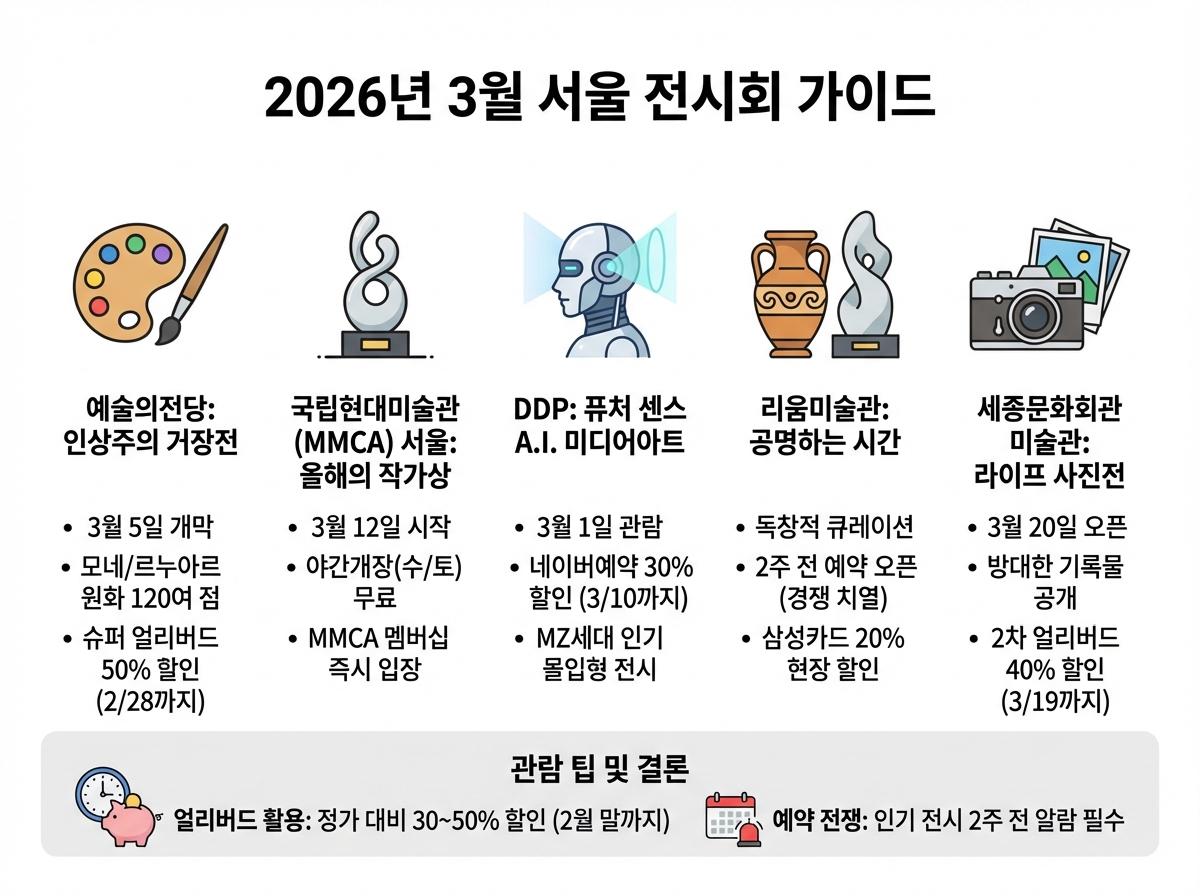 2026년 3월은 예술의전당 인상주의전과 DDP 미디어아트를 필두로 대형 전시가 쏟아지는 달입니다.