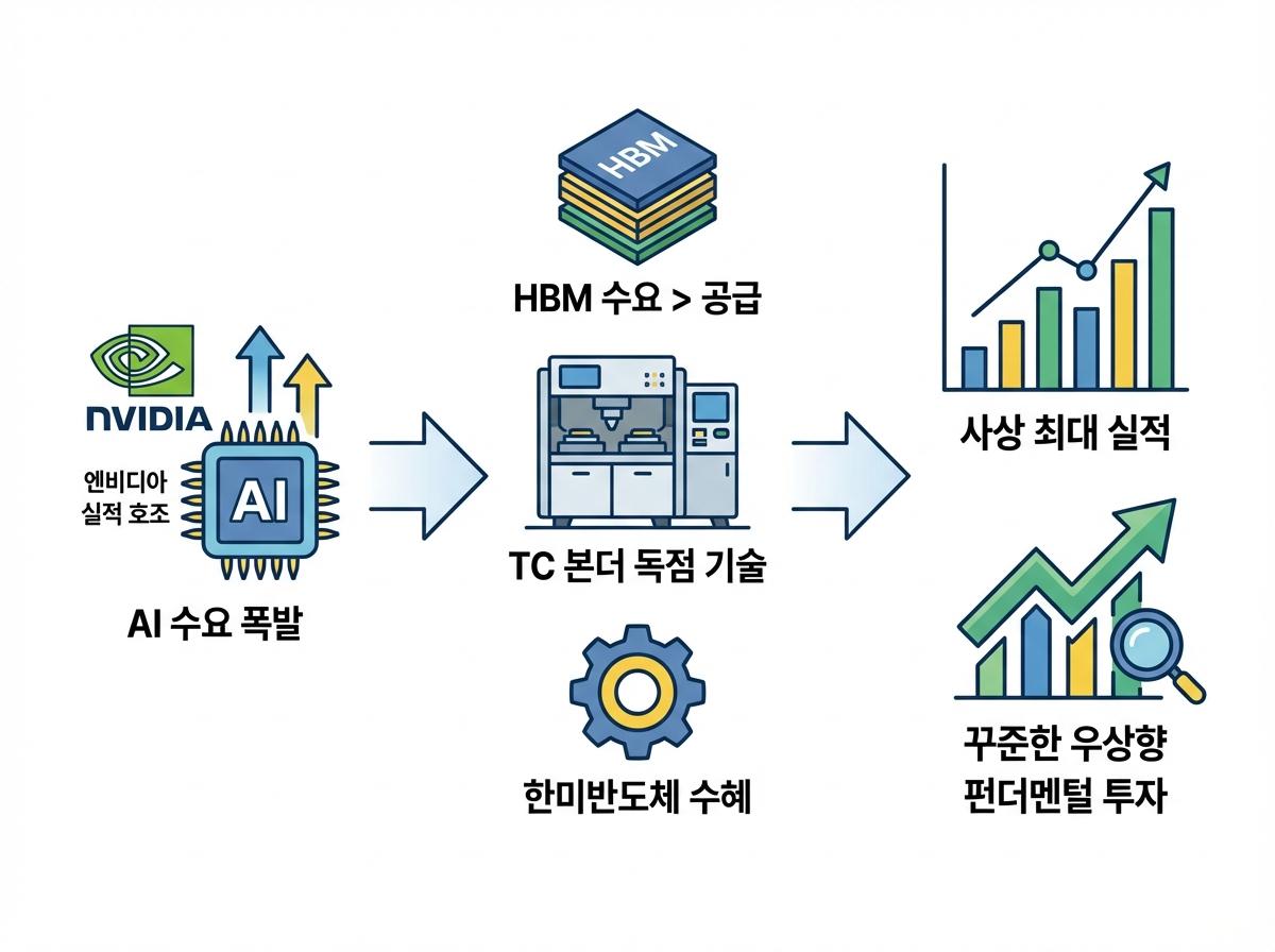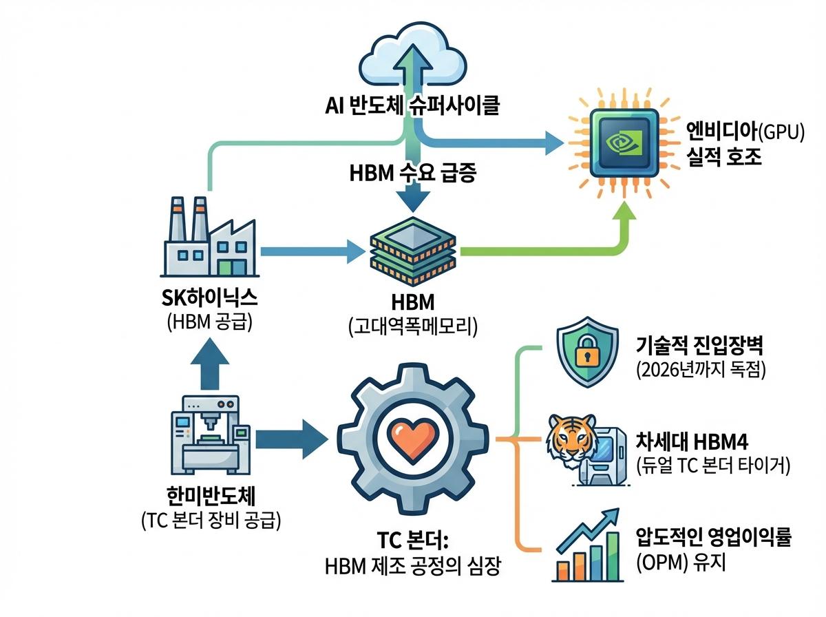 - 이 생태계의 핵심은 GPU 성능 극대화를 위해 필수적으로 탑재되는 **HBM(고대역폭메모리)**이며, 한미반도체는 HBM 제조 공정의 '심장'이라 불리는 TC 본더(TC Bonder) 시장을 장악하고 있습니다.