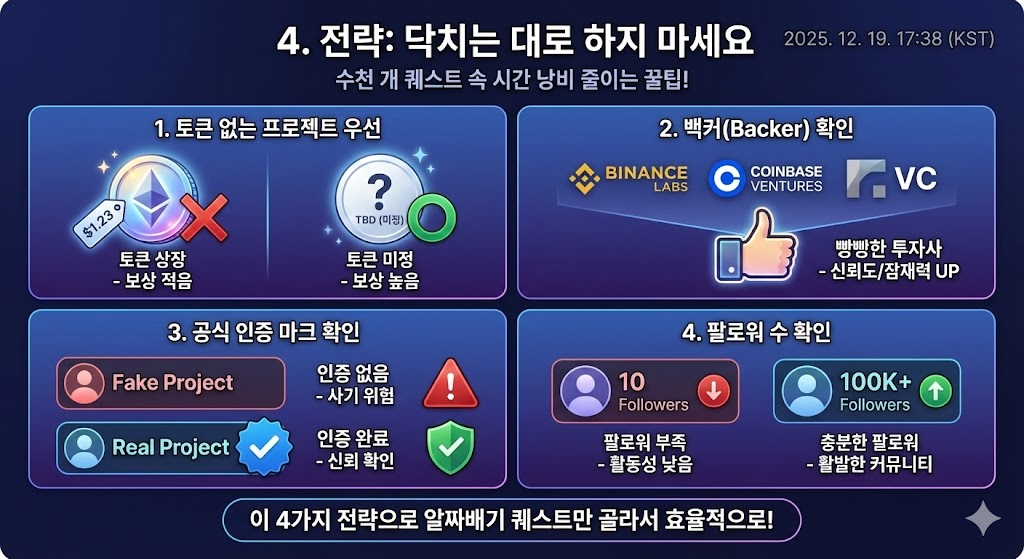 - 토큰이 없는 프로젝트 우선: 이미 토큰이 상장된 프로젝트의 퀘스트는 보상이 짜거나 없을 확률이 높습니다. 'TBD(미정)' 상태인 프로젝트를 공략하세요.