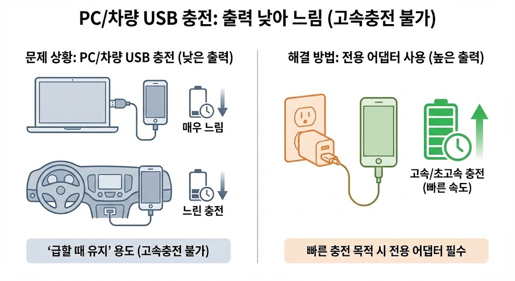 노트북 USB 포트나 차량 USB는 출력이 낮아 고속충전이 안 되거나 매우 느린 경우가 많습니다.