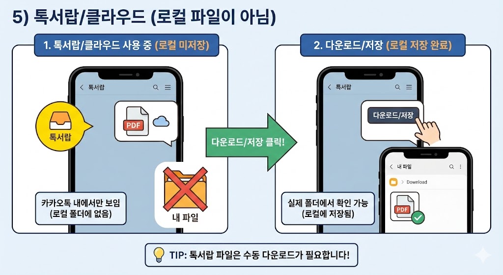 - 이 경우에는 카톡에서 파일을 선택한 뒤 **‘다운로드/저장’**을 눌러 로컬 저장을 해야 실제 폴더에서 확인됩니다.
