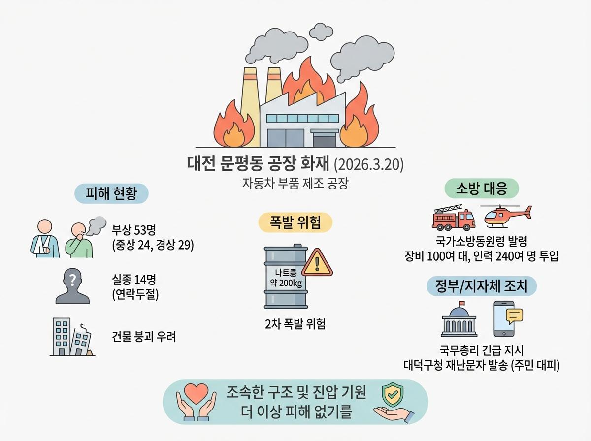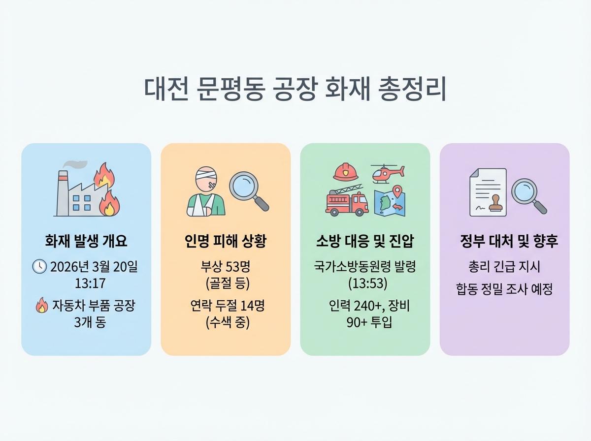 2026년 3월 20일 대전 대덕구 문평동 자동차 부품 공장에서 발생한 대형 화재의 전말, 사상자 및 실종자 등 피해 규모, 소방 대응 상황을 빠르고 정확하게 정리해 드립니다.