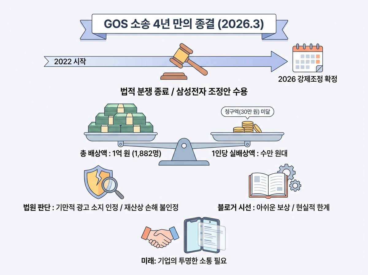 2022년에 촉발된 갤럭시 S22 GOS 성능 제한 집단 소송은 2026년 3월 법원의 강제 조정 수용으로 마침내 마무리되었어요.