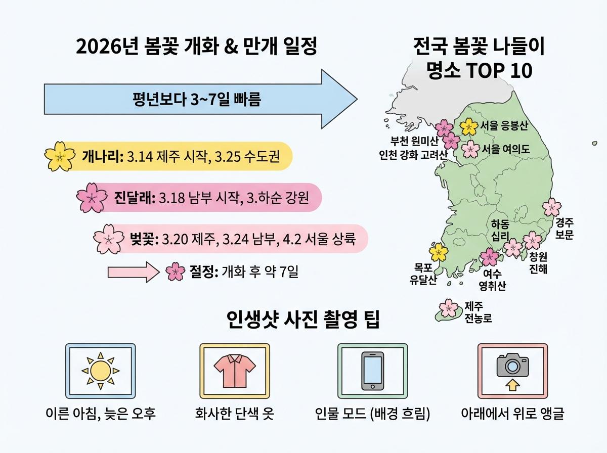 - 2026년 봄꽃은 기후 영향으로 평년보다 약간 빠르게 개화하며 지역별로 뚜렷한 편차가 존재합니다.