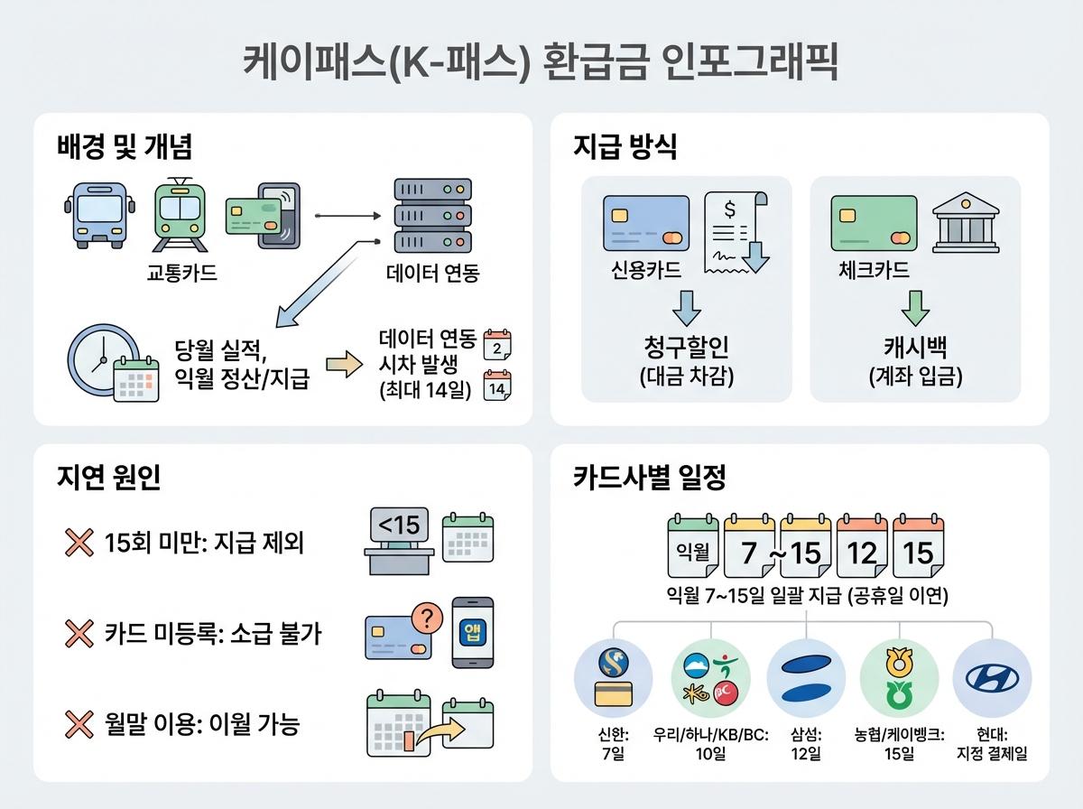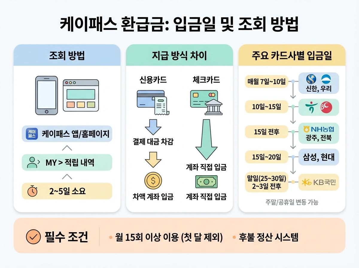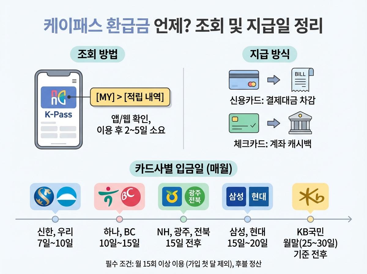 매월 꼭 확인해야 하는 K-패스 환급금 조회 방법부터 신용카드 및 체크카드 등 주요 카드사별 정확한 캐시백 지급일을 한눈에 확인해 보세요.
