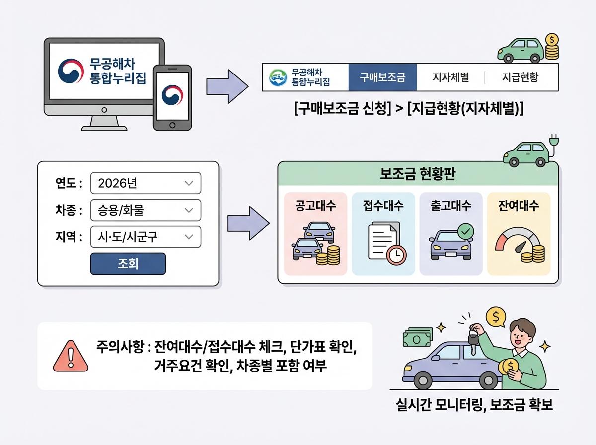 - 보조금 실시간 현황은 환경부 공식 사이트인 '무공해차 통합누리집'에서 조회합니다.