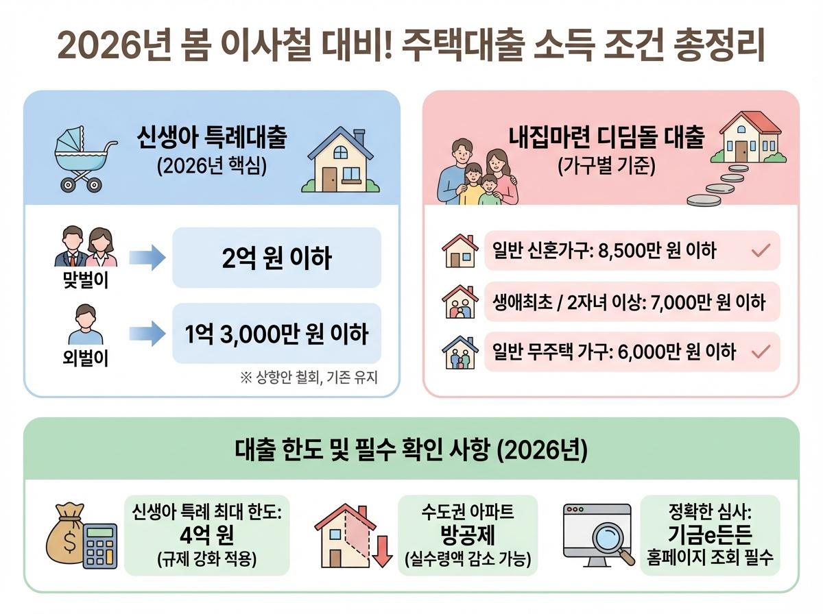 2026년 봄 이사를 앞둔 분들을 위해 신생아 특례대출과 내집마련 디딤돌 대출의 최신 소득 조건, 대출 한도 및 주의사항을 알기 쉽게 정리했습니다.