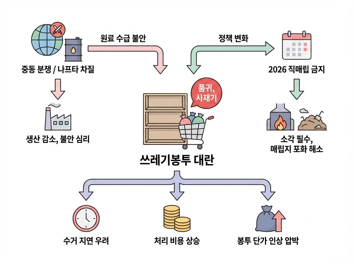 현재의 쓰레기봉투 대란은 실제 물량 부족이 아니라 국제 정세 불안에 따른 심리적 요인과 사재기가 빚어낸 일시적인 유통 혼란입니다.