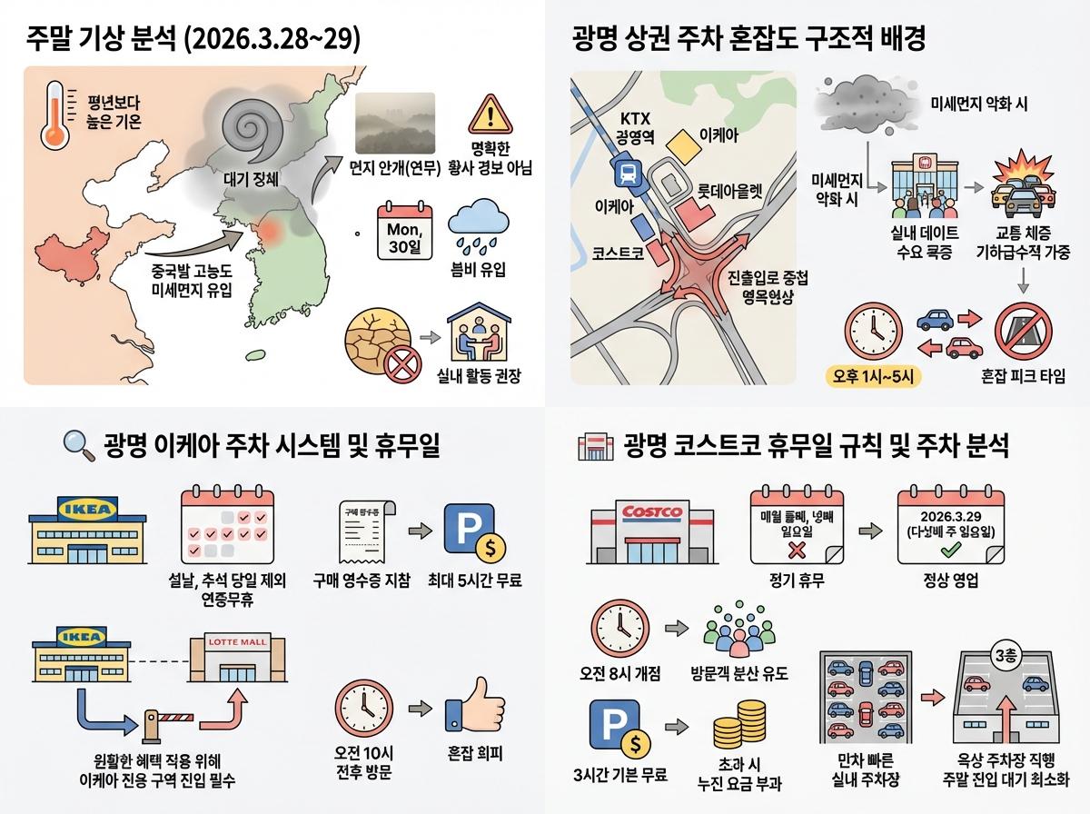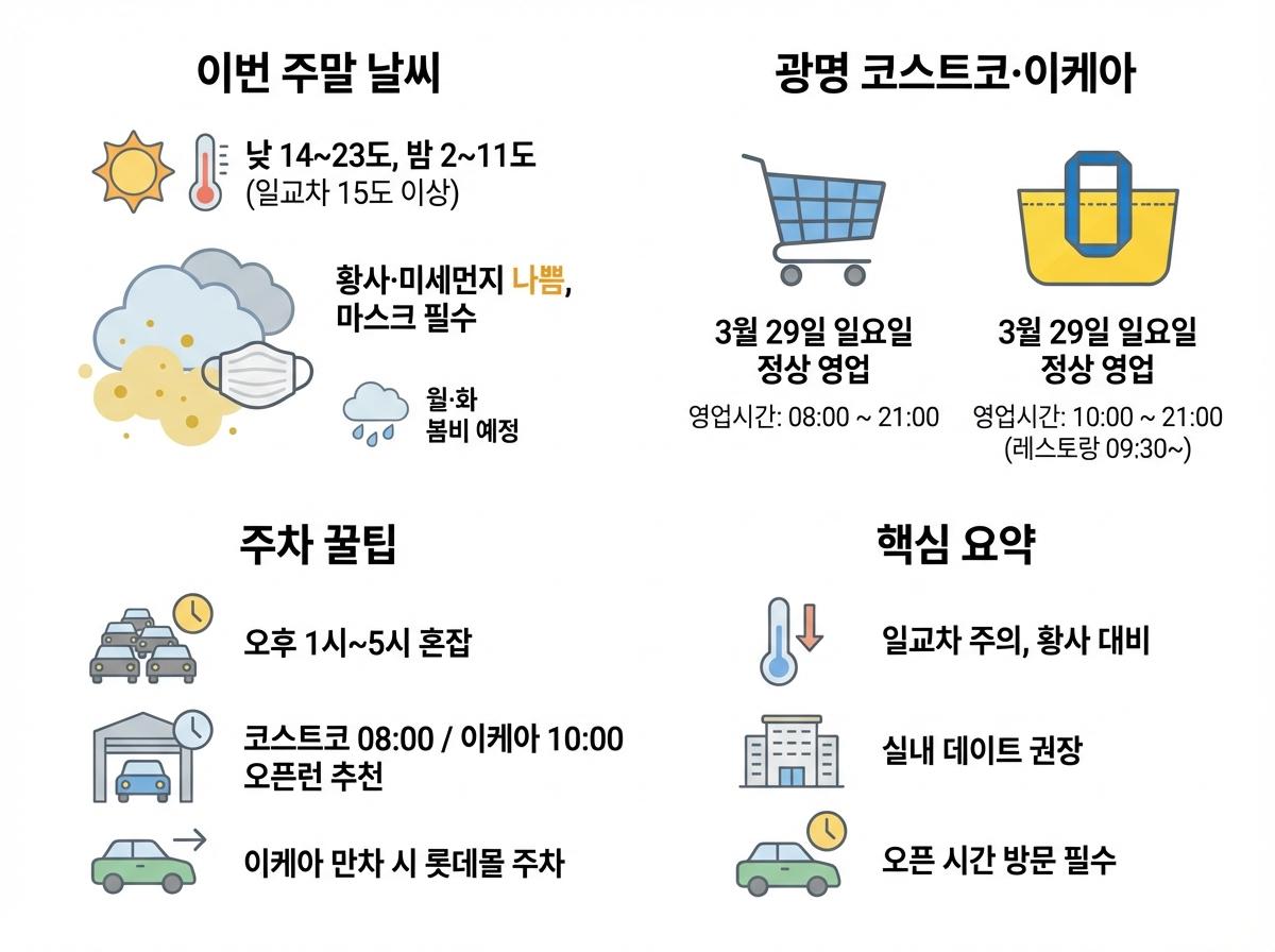 이번 주말 전국 봄비 및 황사 날씨 예보와 함께 쾌적한 실내 데이트를 위한 광명 이케아 주차장 혼잡도 피하는 꿀팁, 2026년 3월 코스트코 광명점 영업일 정보를 알아봅니다.