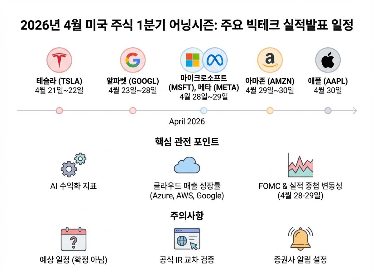 2026년 4월 미국 주식 1분기 어닝시즌을 맞이해 테슬라, 마이크로소프트, 애플 등 주요 빅테크 기업의 실적발표 예상 일정과 핵심 관전 포인트를 한눈에 알기 쉽게 정리했습니다.
