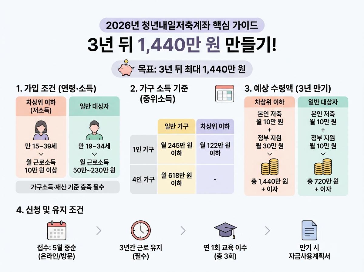 2026년 청년내일저축계좌 4월 가입 조건, 기준 중위소득, 신청 방법 및 모의계산을 통한 예상 수령액을 총정리했습니다.