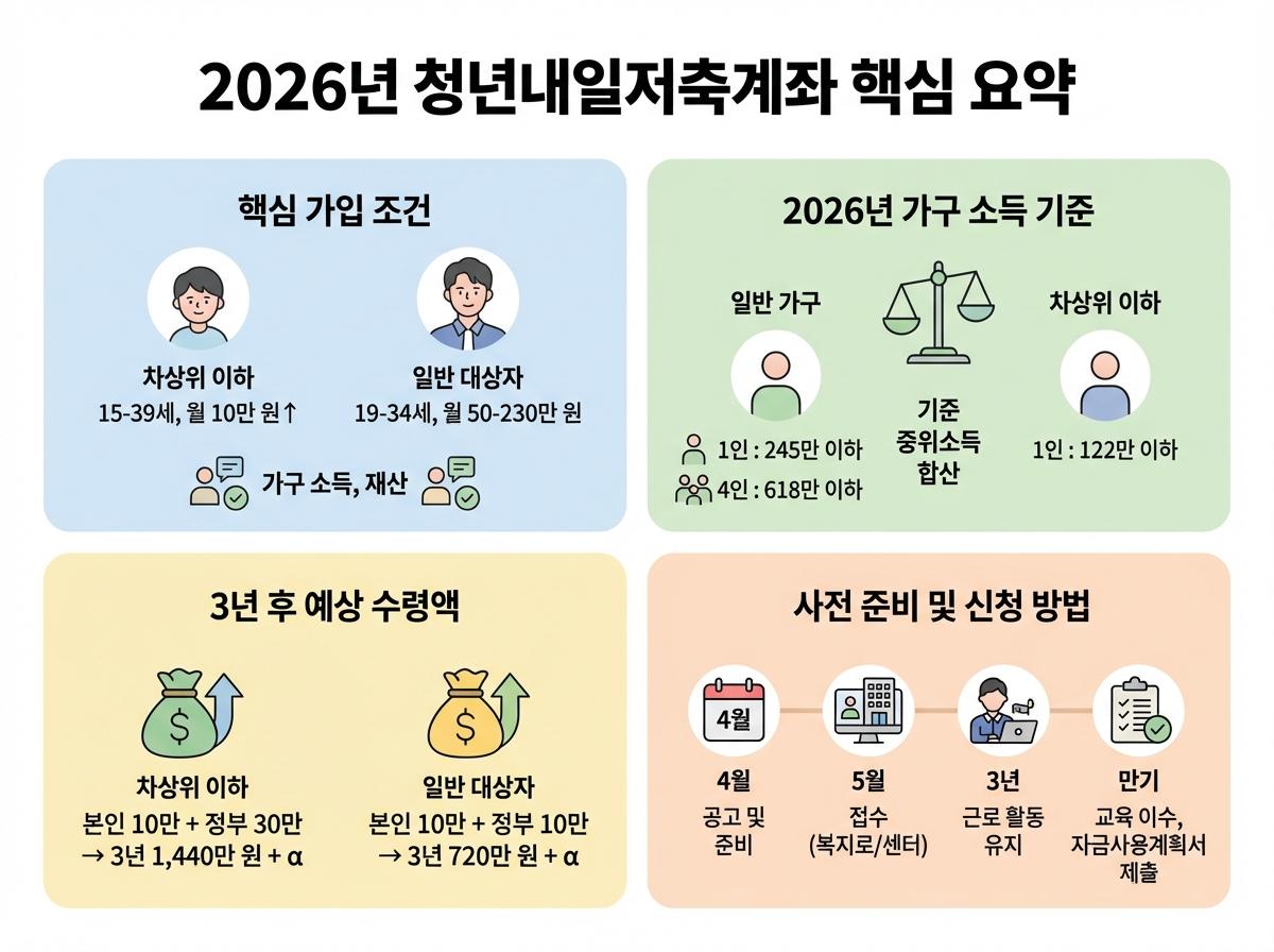 - 2026년 청년내일저축계좌는 만 15~39세, 월 10만 원 이상 소득자 중 중위소득 50% 이하 청년이 대상입니다.