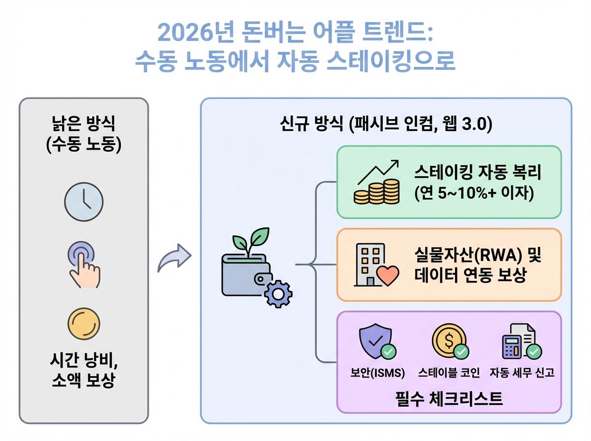 시간만 낭비하는 낡은 노동형 앱테크는 그만! 2026년 최신 트렌드인 코인 예치 및 실물자산(RWA) 연동 스테이킹 보상까지, 방치형으로 자산을 불리는 신규 돈버는 어플의 핵심 정보를 알아봅니다.