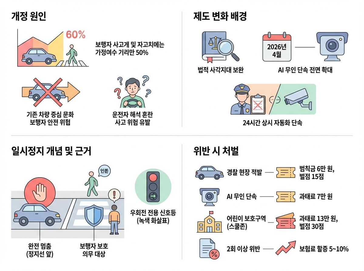 - 2026년 4월을 기점으로 우회전 일시정지 위반을 정밀 감지하는 AI 무인 단속 카메라가 주요 도심에 전면 확대 설치됨.