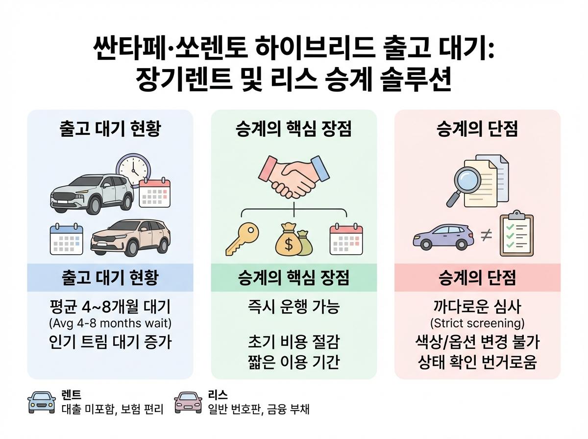 인기 모델인 싼타페와 쏘렌토 하이브리드의 긴 출고 대기 기간에 지친 분들을 위한 현실적인 대안을 소개합니다.
