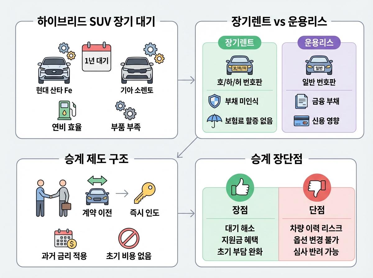- 장점으로는 장기 대기 문제를 즉각적으로 해소하며, 기존 차주의 승계 지원금을 통해 실질 지출 비용을 통제할 수 있음.