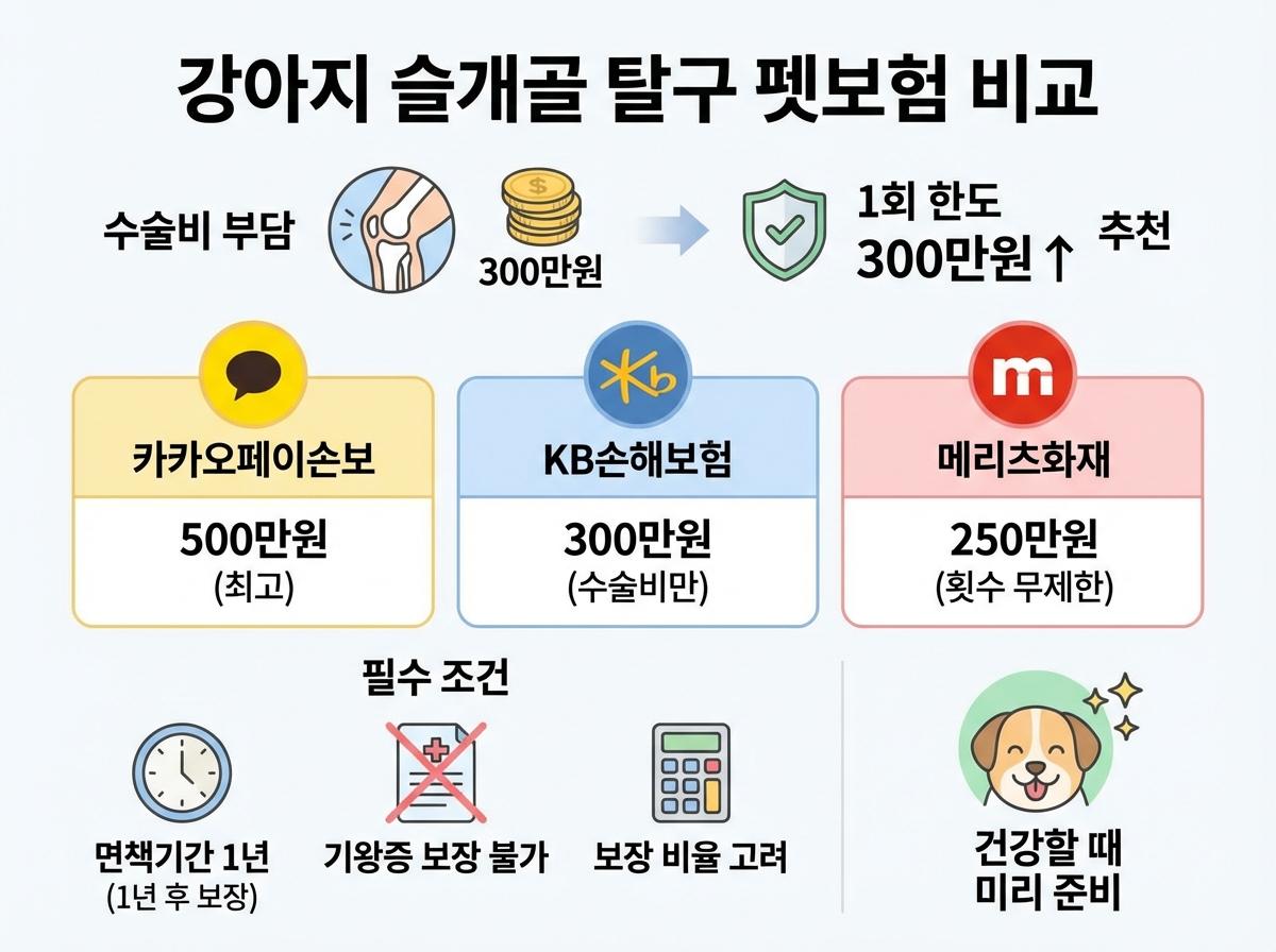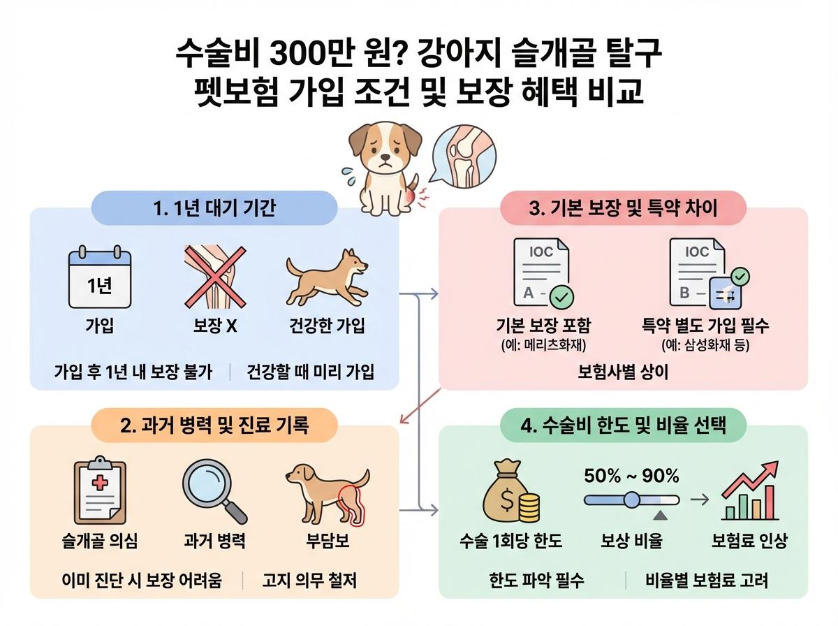 가입 시 1년의 슬개골 면책기간과 기왕증 보장 불가 조항이 있으므로, 반려견이 건강할 때 미리 준비하는 것이 핵심입니다.
