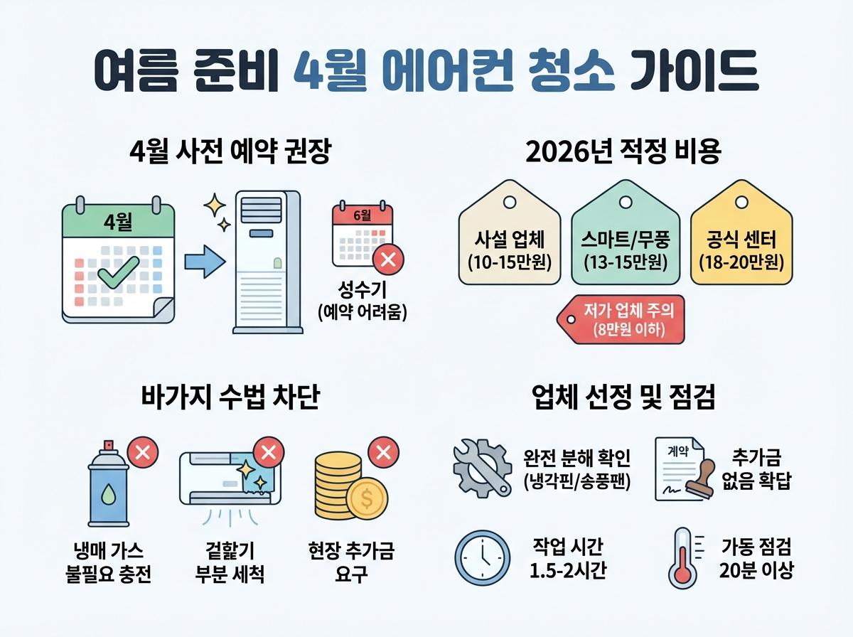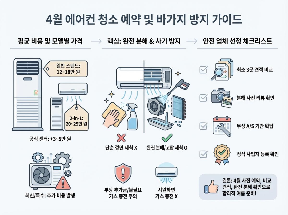 4월 사전 예약의 중요성과 2026년 기준 에어컨 청소 적정 비용, 악덕 업체의 바가지 수법을 피하는 확실한 가이드를 정리했습니다.