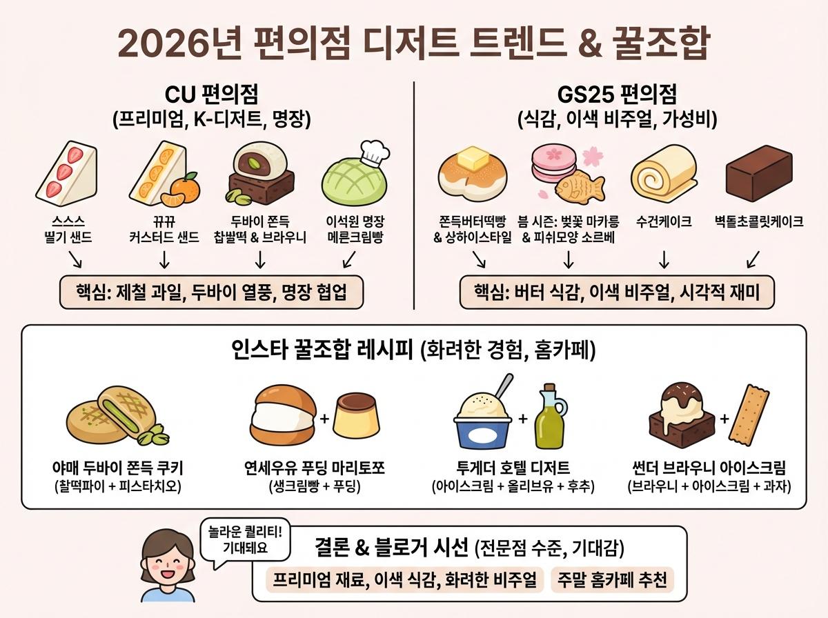 2026년 SNS를 뜨겁게 달구고 있는 CU, GS25 편의점 신상 디저트 리뷰와 인스타 바이럴 꿀조합 레시피를 소개합니다.