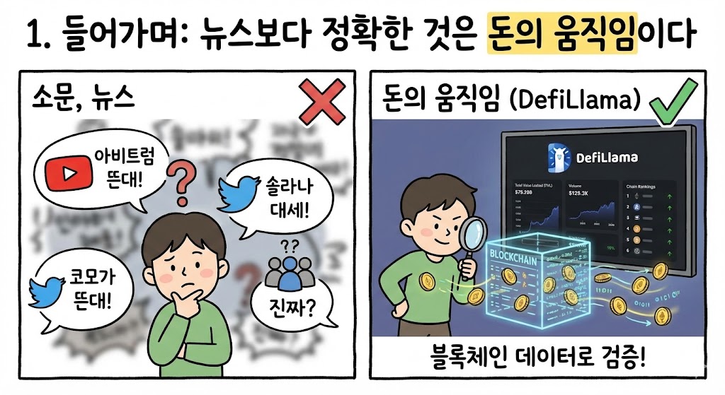 "요즘 아비트럼이 뜬다더라", "솔라나가 대세라더라" 하는 소문을 들었을 때, 진짜인지 아닌지 어떻게 확인할까요? 유튜버의 말을 믿어야 할까요?