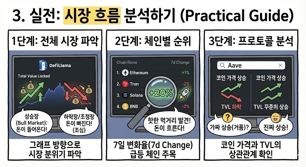 - TVL 하락: 사람들이 돈을 빼서 떠나고 있습니다. 위험 신호입니다. (가격 하락 가능성 높음)